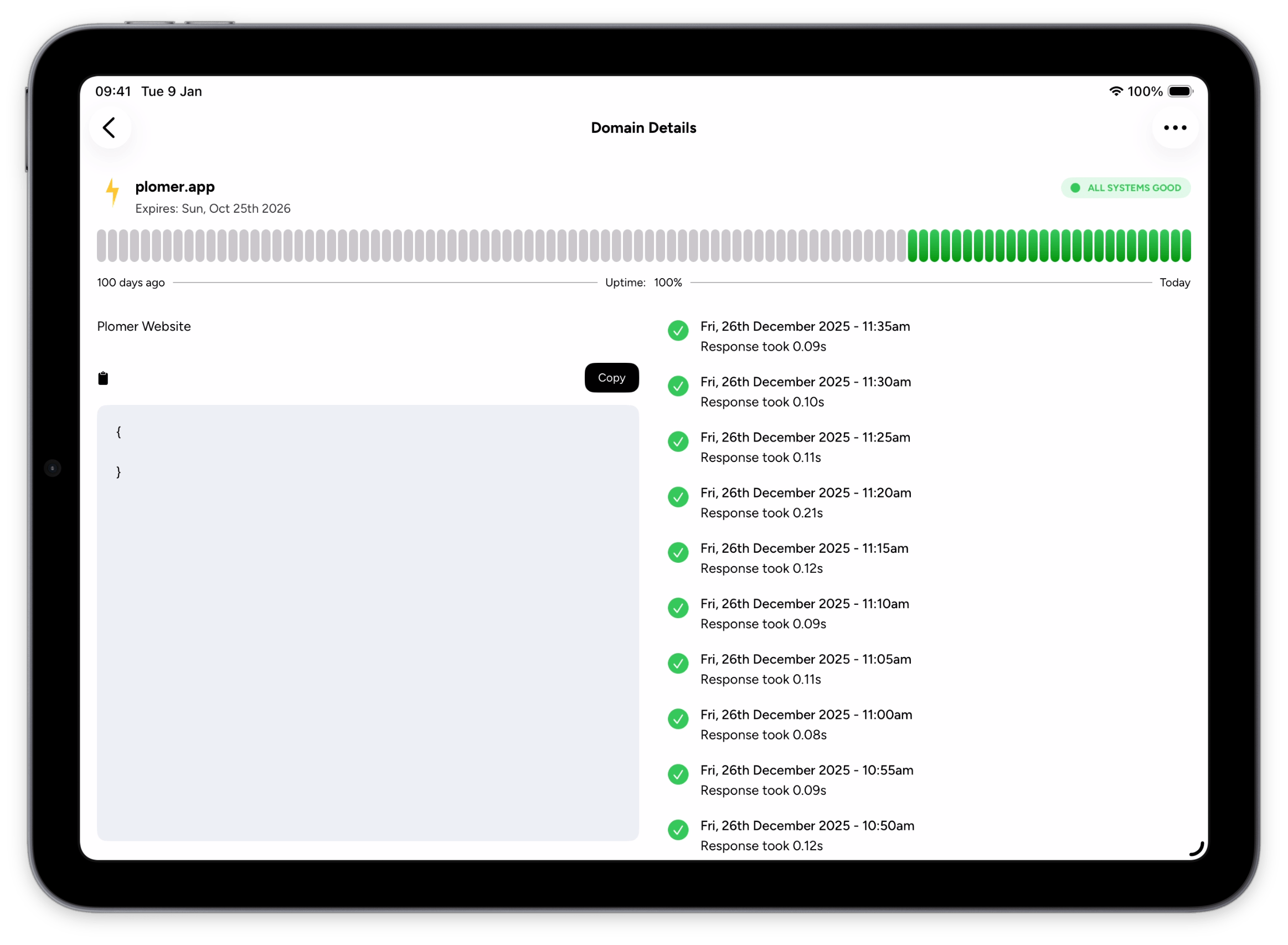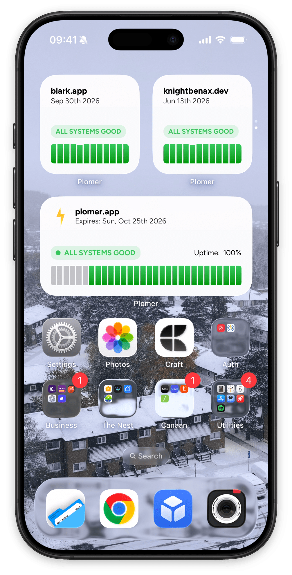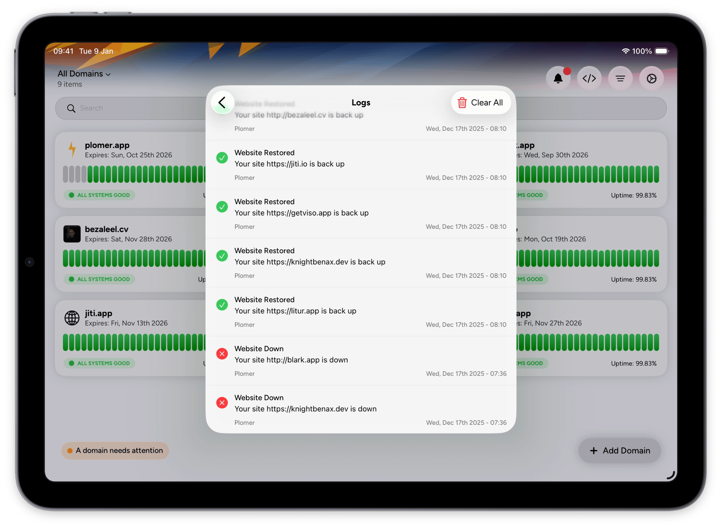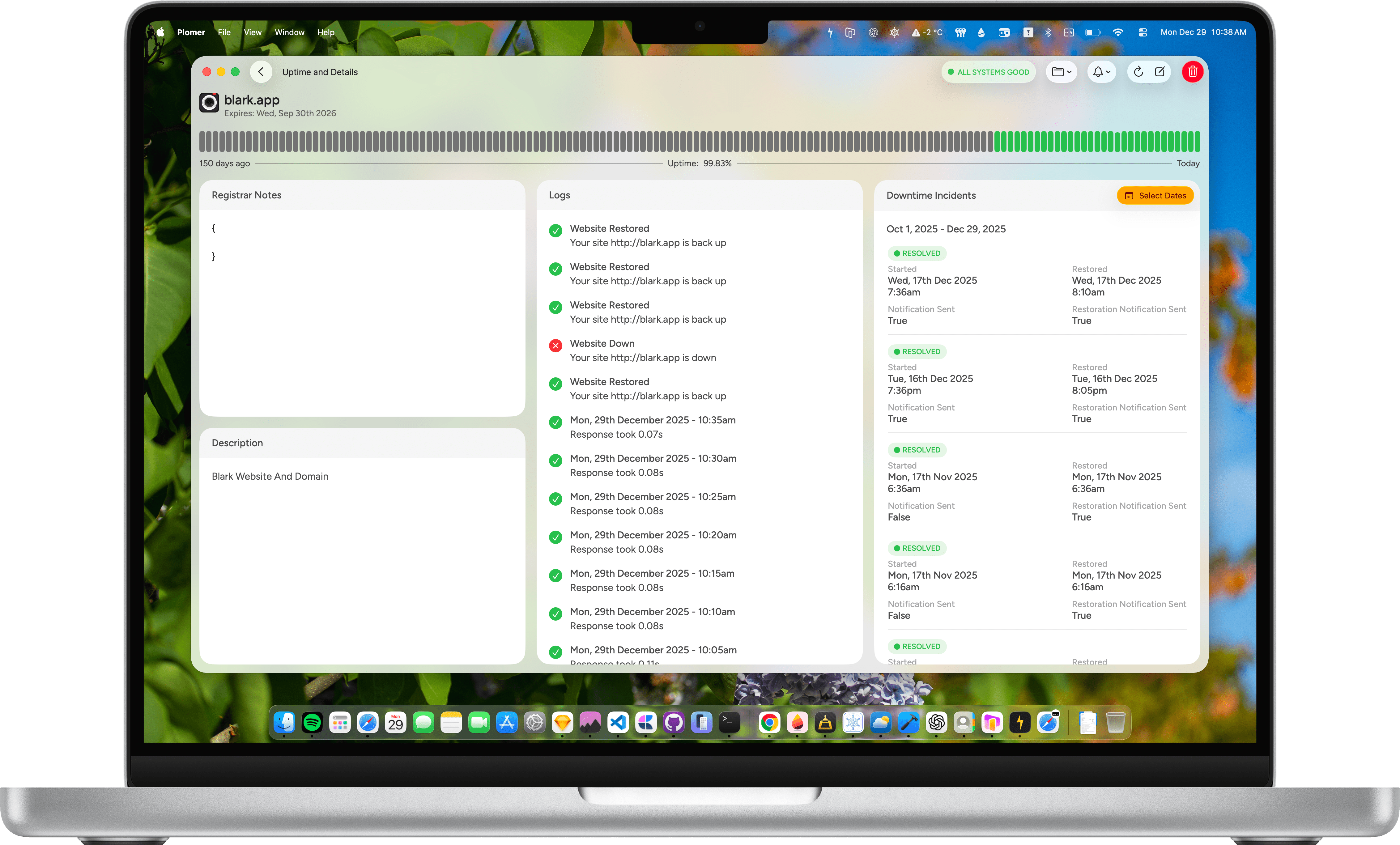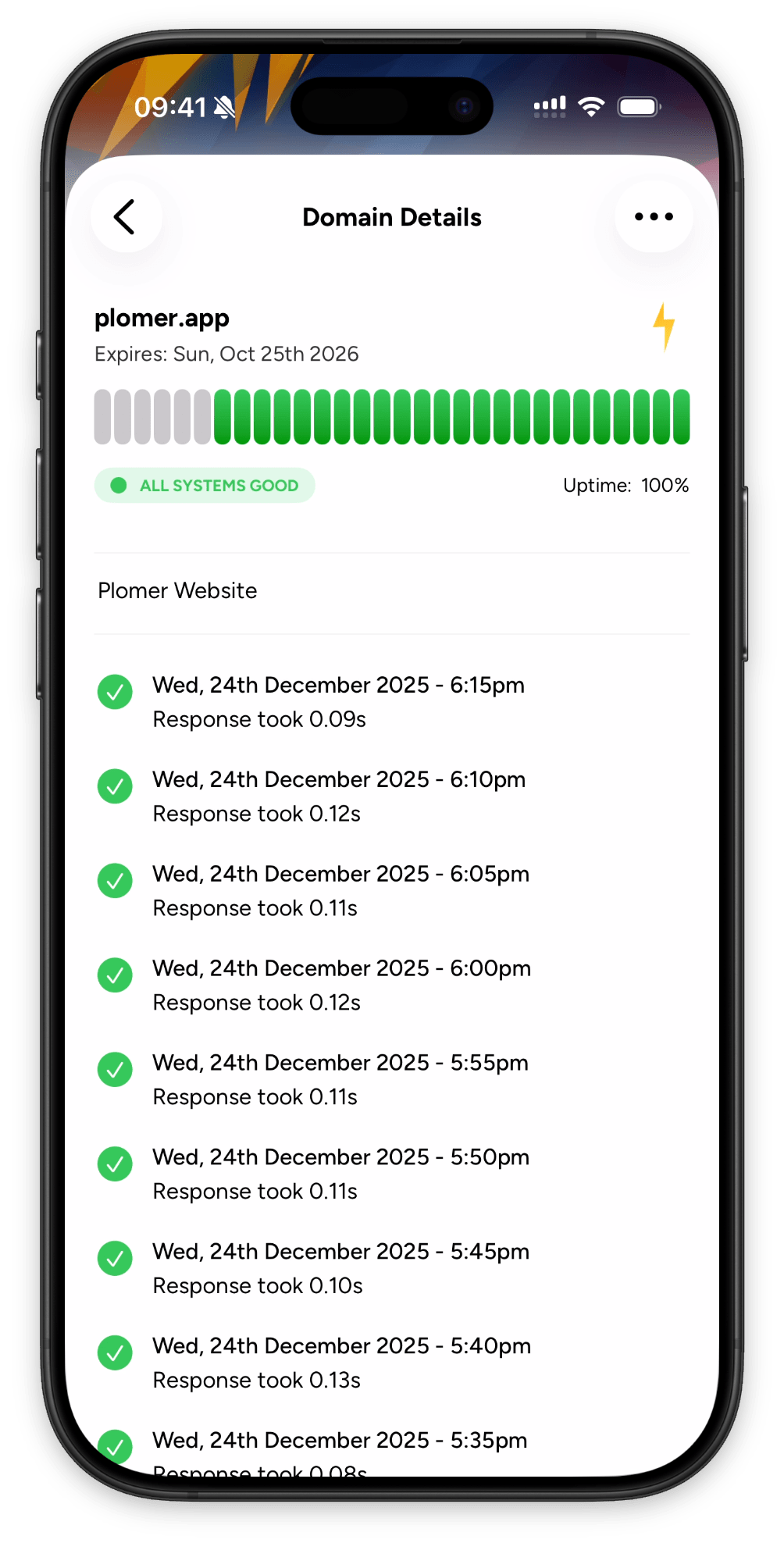 Never miss a critical update. Plomer sends real-time push notifications for outages, DNS changes, SSL