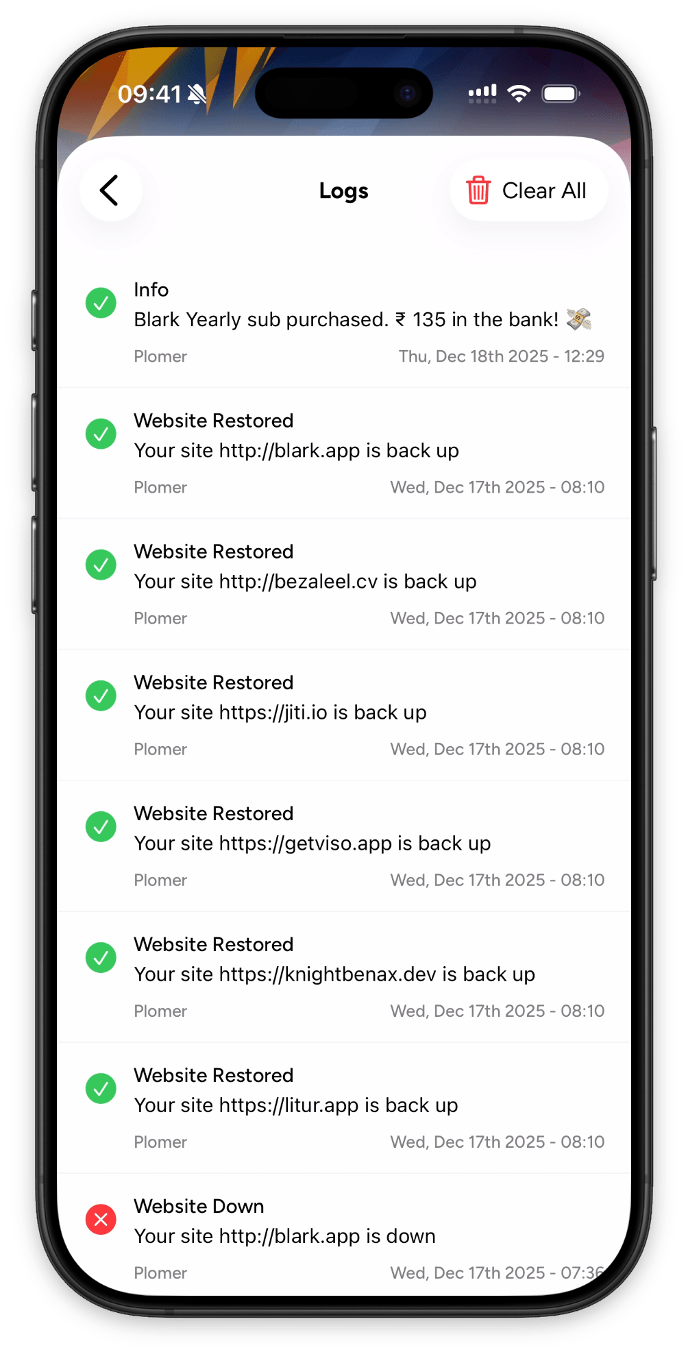 you a chronological view of status changes, webhook events, SSL renewals, downtime alerts, and more. Each log